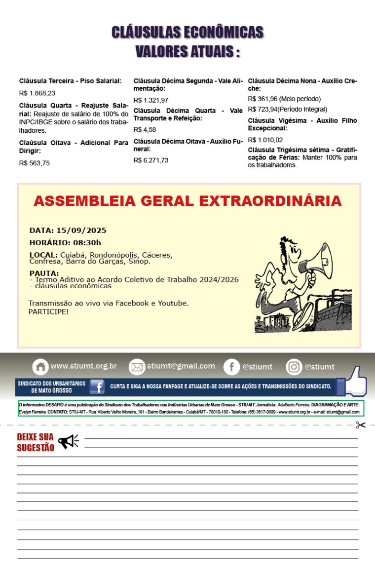 Participem das Assembleias Gerais, filiem-se no nosso Sindicato, estejamos todos unidos, pois é o único caminho, pela graça de Deus, para mantermos e ampliarmos as nossas conquistas através de muita LUTA, LUTA E LUTA!