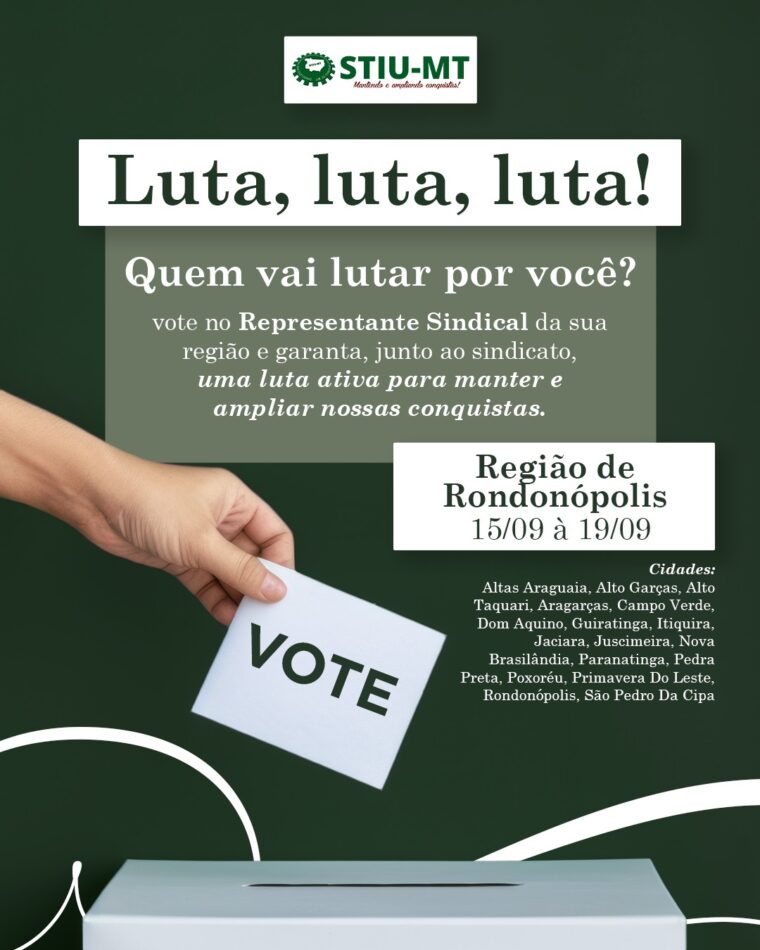 O processo eleitoral para eleger os representantes sindicais de cada região do Estado teve início no dia 11 de agosto em Sinop, seguindo pelas regiões de Rondonópolis, Barra do Garças, Cáceres, Cuiabá e encerrará em Sinop.