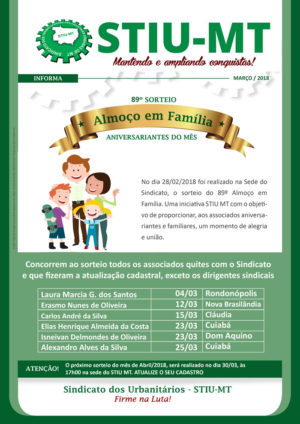 No dia 28/02/2018 foi realizado na Sede do Sindicato, o sorteio do 89º Almoço em Família. Uma iniciativa STIU MT com o objetivo de proporcionar, aos associados aniversariantes e familiares, um momento de alegria e união.