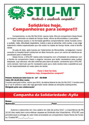 O sorteio da Loteria Federal desta quarta-feira, 28, sorteou um ganhador na campanha da solidariedade em prol da filha Aylla, do companheiro Oseia Neres da Fonseca, realizada durante os meses de maio e junho de 2017. O número sorteado foi o 1853, adquirido pelo companheiro Ozieo da Silva Avalos (Energisa/MT). Sendo assim, o STIU MT parabeniza o ganhador, que leva para casa um notebook.