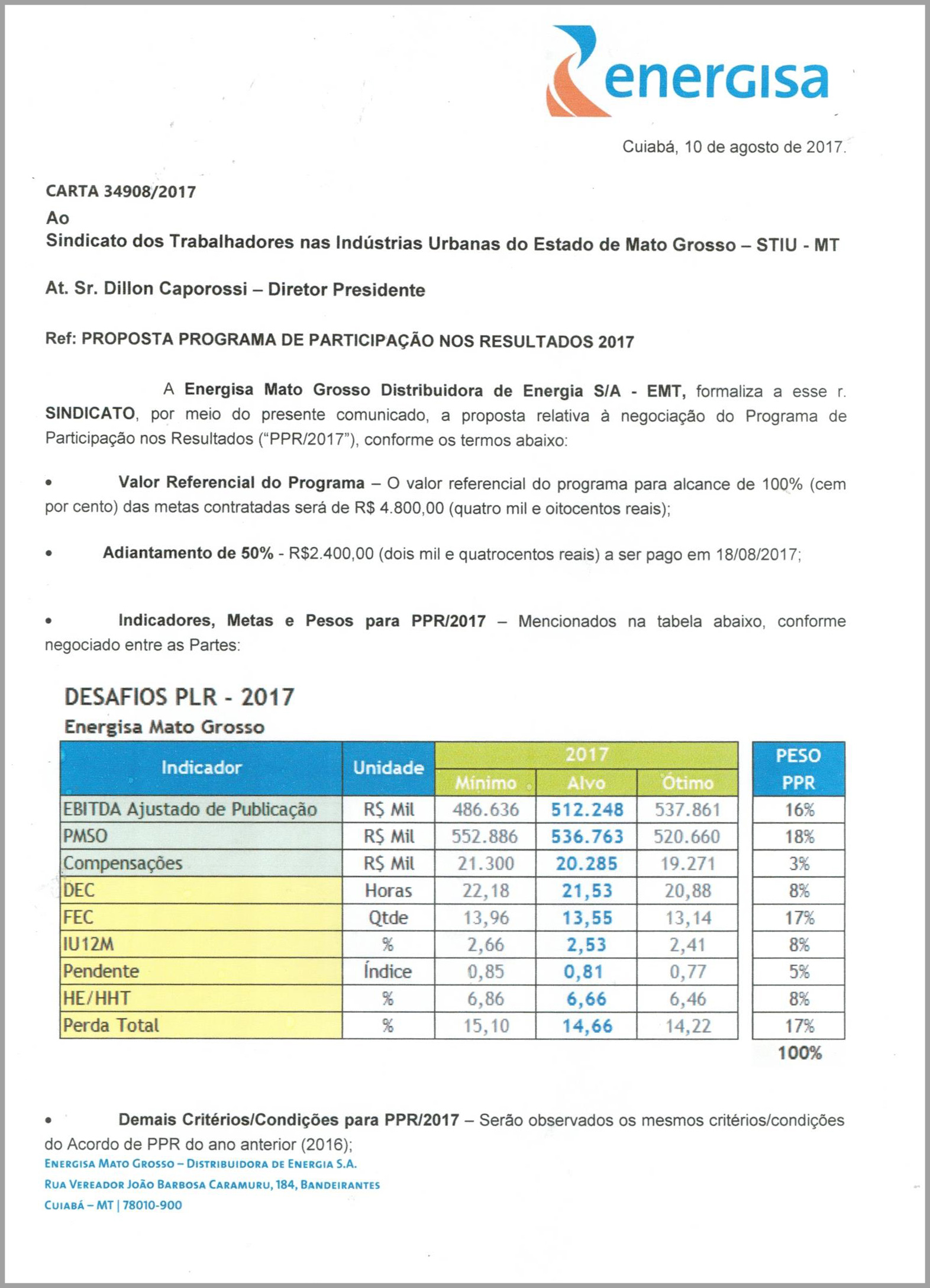 Durante as reuniões com a direção da Energisa MT o STIU/MT tem defendido que os trabalhadores não podem ser responsabilizados por erros na gestão da empresa. Por isso, faz-se necessário que a Energisa MT pague aos trabalhadores um valor adicional como forma de compensar os quatro indicadores que foram zerados por erros da administração da empresa.
