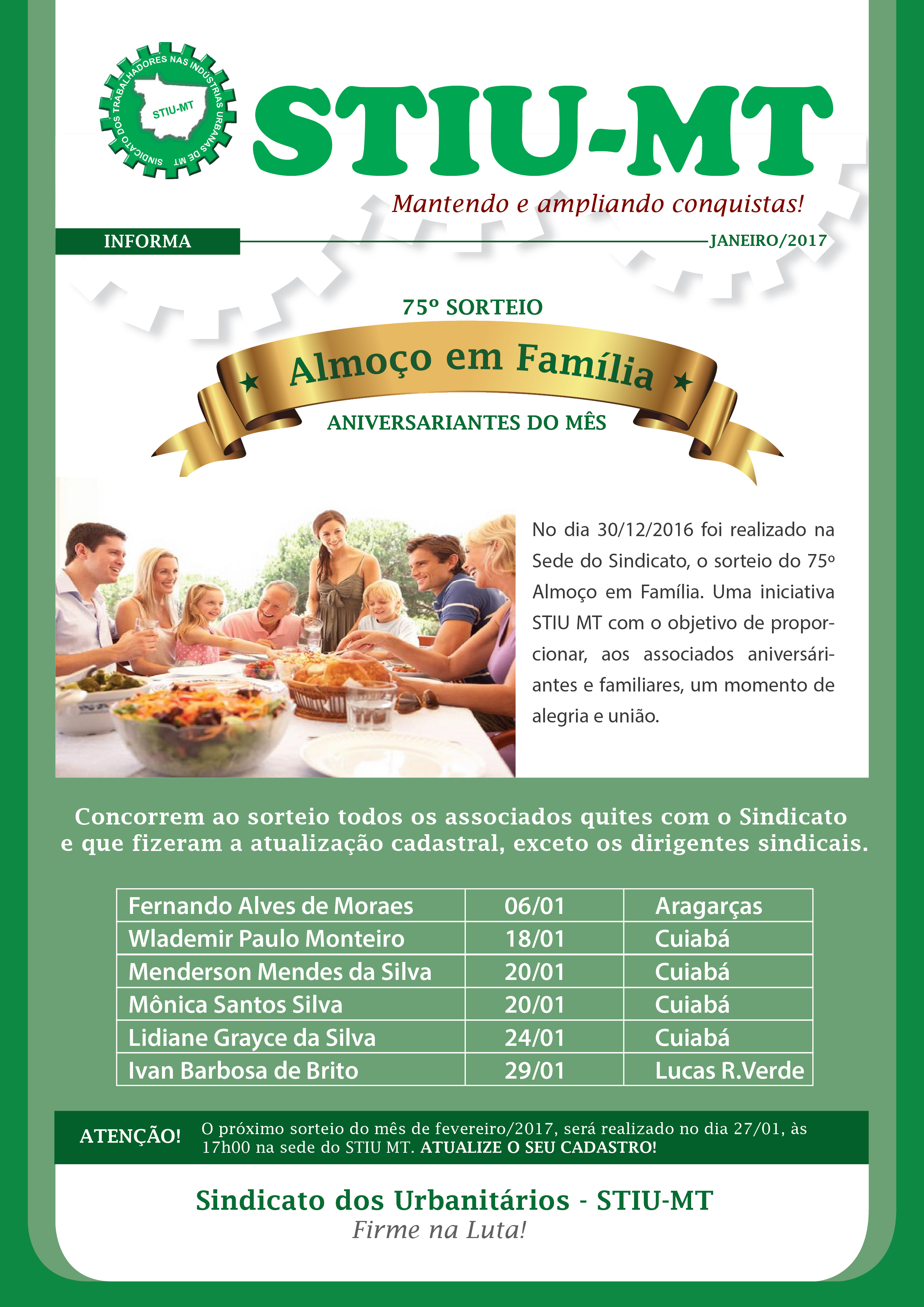 Atenção: O próximo sorteio do mês de fevereiro/2017, será realizado no dia 27/01, às 17h00 na sede do STIU/MT.