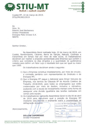 - Os trabalhadores realizarão Assembleia Geral no dia 05 de abril de 2019 para discutirem qual a posição da Energisa MT mediante esta decisão e analisarão sobre a possibilidade de deflagração de greve.