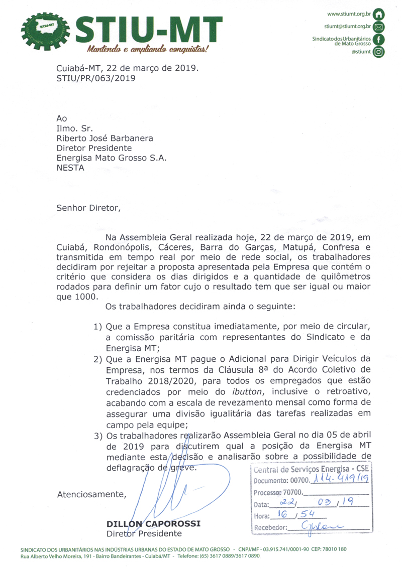 Com participação maciça na Assembleia Geral realizada no dia 22 de março último, trabalhadores rejeitaram a proposta da Energisa MT para alteração no Acordo Coletivo de Trabalho e cobram o pagamento do Adicional para Dirigir Veículos da Empresa e constituição da comissão paritária, nos termos da Cláusula 8ª do ACT 2018/2020. Veja a carta STIU/PR/063 protocolada na Energisa MT.